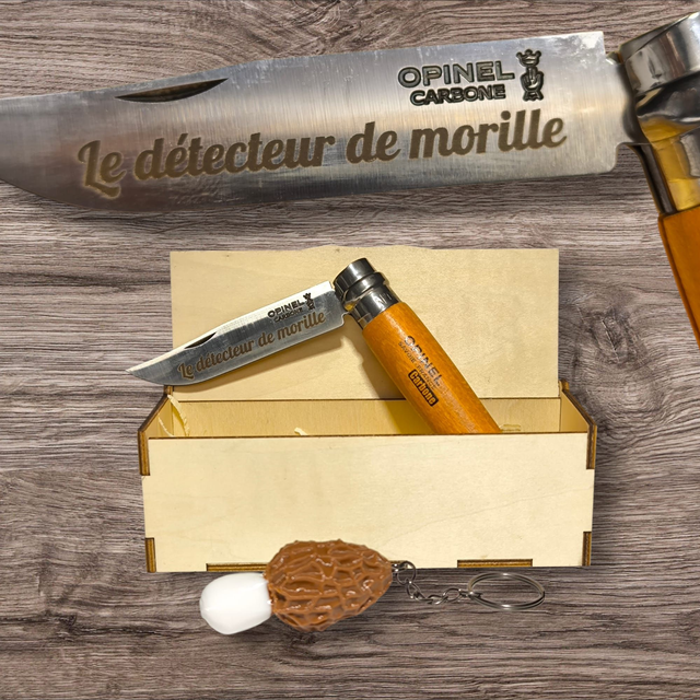 Le kit se compose d'un couteau de poche gravé sur la lame, d'un porte clé morille en 3D, le tout dans une boite cadeau découpé et gravé en bois de tilleul.