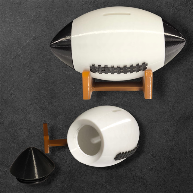Tirelire en impression 3D forme ballon de rugby sur son socle